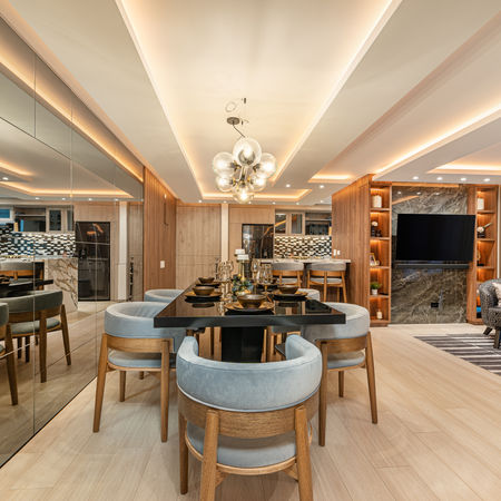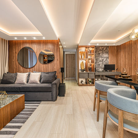 This project was a crafted adventure focused on creating tailored luxury custom-made furniture specifically designed for a three-bedroom apartment. In this unique layout, one of the bedrooms was transformed into a sophisticated office space, seamlessly blending functionality with elegance. The project features exquisite wood built-ins that not only provide ample storage but also enhance the aesthetic appeal of the living environment. These built-ins were designed with precision, ensuring that every inch of space is utilized effectively while maintaining a cohesive look throughout the apartment. The lighting design plays a crucial role in this project, with strategically placed fixtures that create a warm and inviting atmosphere. Various types of lighting, including ambient, task, and accent lighting, were thoughtfully incorporated to highlight key areas and features of the apartment, ensuring that each room is both practical and visually stunning. Additionally, the ceiling designs are a remarkable highlight of this project. Intricate details and innovative architectural elements were introduced to elevate the overall ambiance of the space. These ceiling treatments not only add depth and dimension but also serve as a striking focal point that draws the eye upward, enhancing the sense of luxury. The furniture design is another significant aspect of this project, with each piece being custom-made to fit the specific needs and style of the apartment's occupants. From elegant sofas to bespoke dining tables, every item was crafted with the utmost attention to detail, ensuring that comfort and style go hand in hand. The overall design reflects an amazing unique character, combining modern aesthetics with timeless elegance, resulting in a living space that is both functional and visually captivating. This project truly embodies the essence of luxury living, where every element has been thoughtfully curated to create a harmonious and inviting atmosphere.