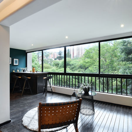 This is a remodel project in Medellin, Poblado. The property was a complete different layout so every single wall was demolished and a new Layout was created. In the new plan, there is a big living, dinning, and open kitchen area, connected to open deck terrace/style space, that holds a bar and faux green wall.