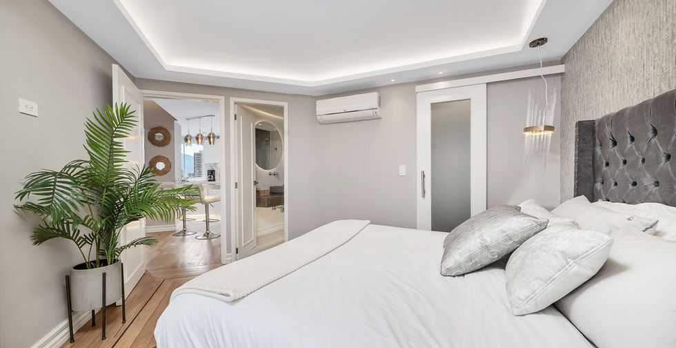 Main bedroom has a queen size bed, and air conditioning, en-suite bathroom and walk in closet. Nice size window for natural light and black out drapes. Lighting includes pendant nightstand lamps, indirect led on ceiling and led can lights.